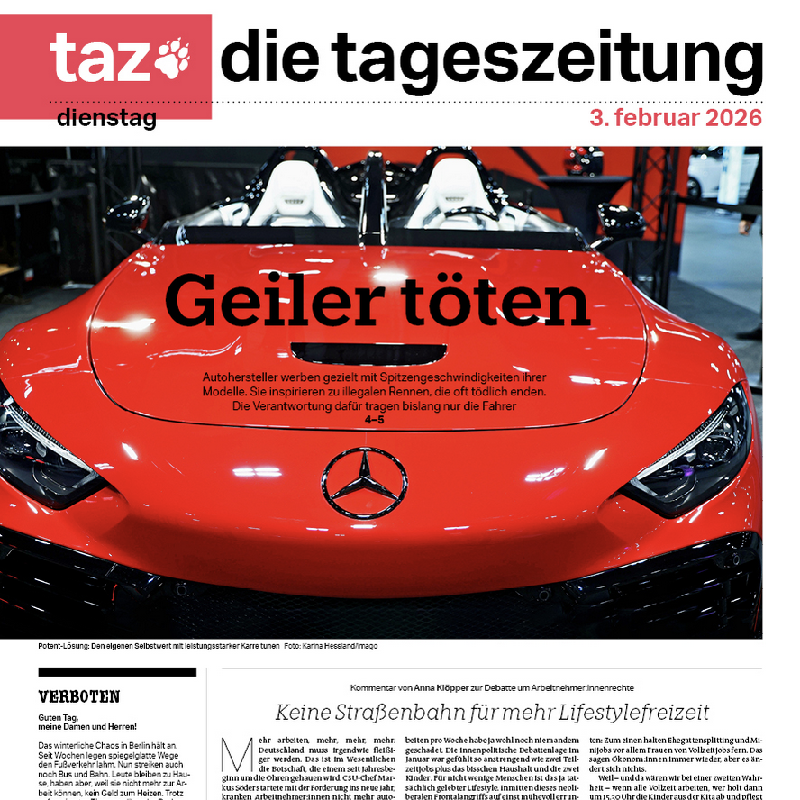 Immer wieder sterben Menschen bei illegalen Autorennen. Schuld haben die Fahrer. Aber welche Verantwortung tragen die Autohersteller? Mein Essay in der @tazgetroete von Dienstag. Hier schon mal die Titelseite: