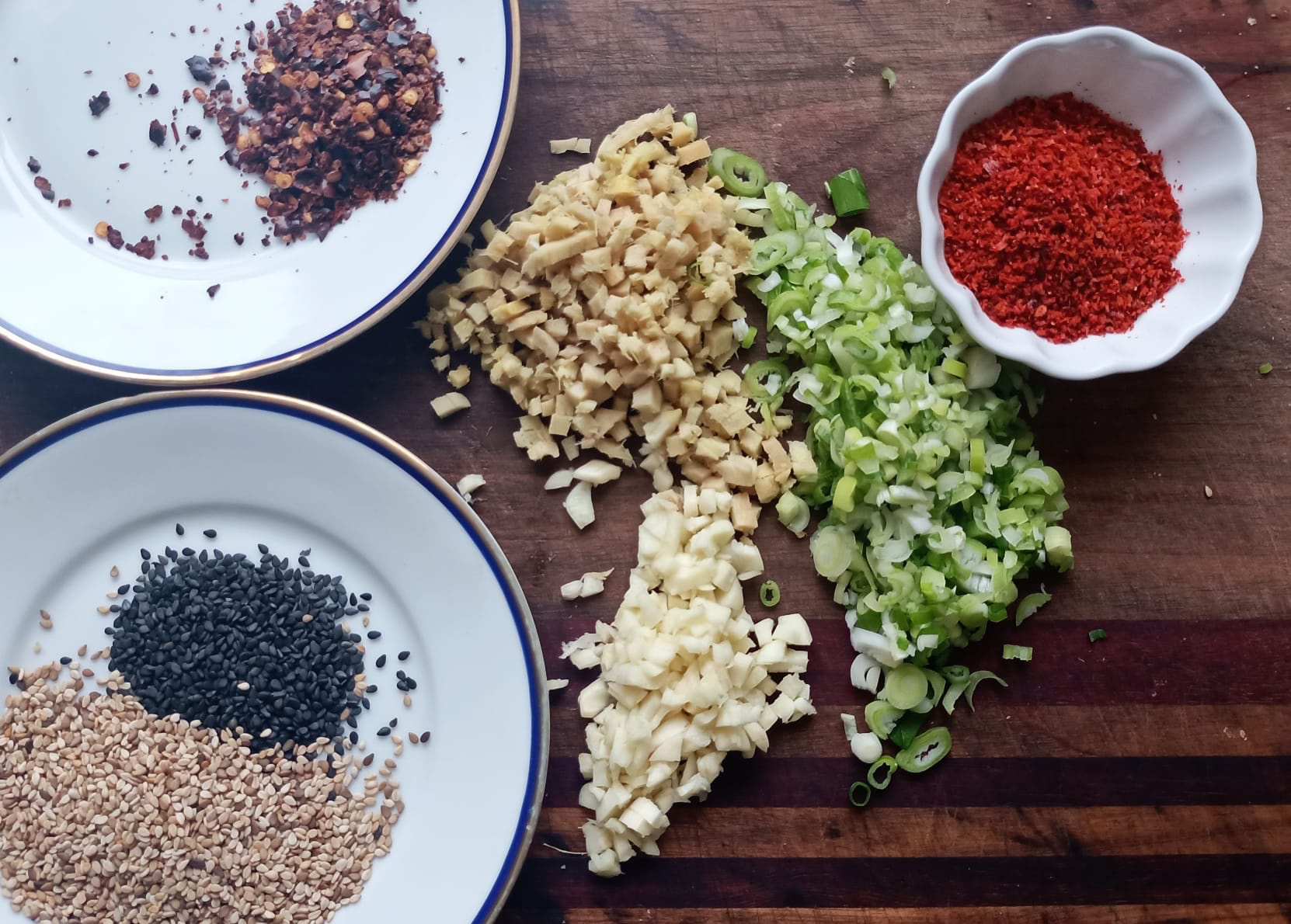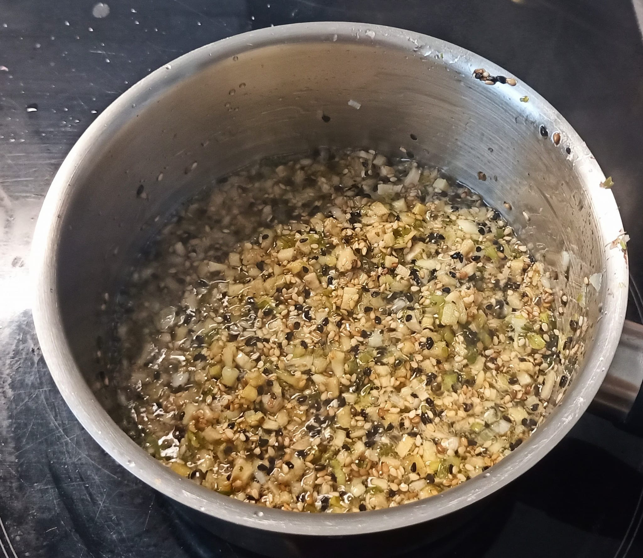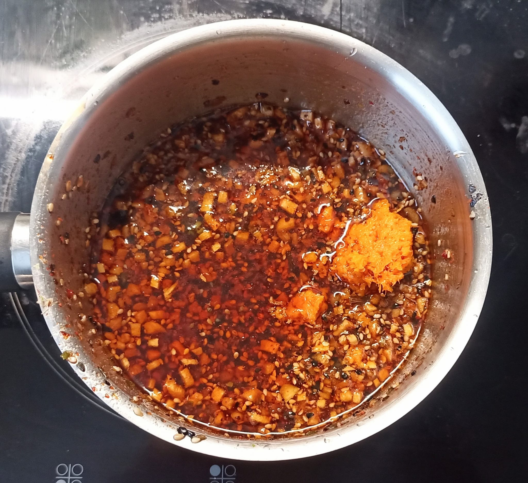 #Fr眉hlingszwiebel #Knoblauch + #Ingwer fein hacken, in reichlich 脰l sanft k枚cheln, bis es duftet. #Sesam zugeben, zuletzt #Paprika #Chili.flocken #Orangenabrieb #Orangensaft + #Sojasauce unterr眉hren. Alles ziehen lassen.