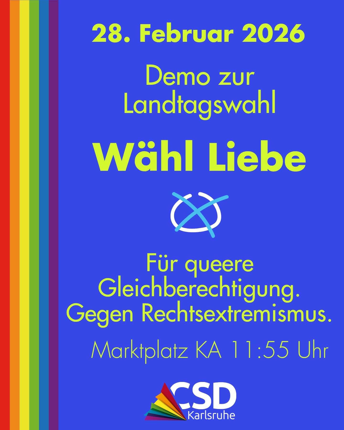- 28. Februar, 11:55 Uhr, Karlsruhe Marktplatz: Wähl Liebe! Kundgebung des CSD Karlsruhe