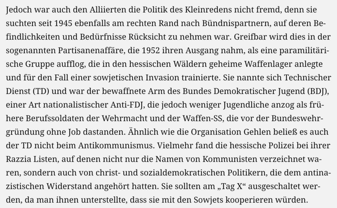 Jedoch war auch den Alliierten die Politik des Kleinredens nicht fremd, denn sie suchten seit 1945 ebenfalls am rechten Rand nach Bündnispartnern, auf deren Befindlichkeiten und Bedürfnisse Rücksicht zu nehmen war. Greifbar wird dies in der sogenannten Partisanenaffäre, die 1952 ihren Ausgang nahm, als eine paramilitärische Gruppe aufflog, die in den hessischen Wäldern geheime Waffenlager anlegte und für den Fall einer sowjetischen Invasion trainierte. Sie nannte sich Technischer Dienst (TD) und war der bewaffnete Arm des Bundes Demokratischer Jugend (BDJ), einer Art nationalistischer Anti-FDJ, die jedoch weniger Jugendliche anzog als frühere Berufssoldaten der Wehrmacht und der Waffen-SS, die vor der Bundeswehrgründung ohne Job dastanden. Ähnlich wie die Organisation Gehlen beließ es auch der TD nicht beim Antikommunismus. Vielmehr fand die hessische Polizei bei ihrer Razzia Listen, auf denen nicht nur die Namen von Kommunisten verzeichnet waren, sondern auch von christ- und sozialdemokratischen Politikern, die dem antinazistischen Widerstand angehört hatten. Sie sollten am „Tag X“ ausgeschaltet werden, da man ihnen unterstellte, dass sie mit den Sowjets kooperieren würden.