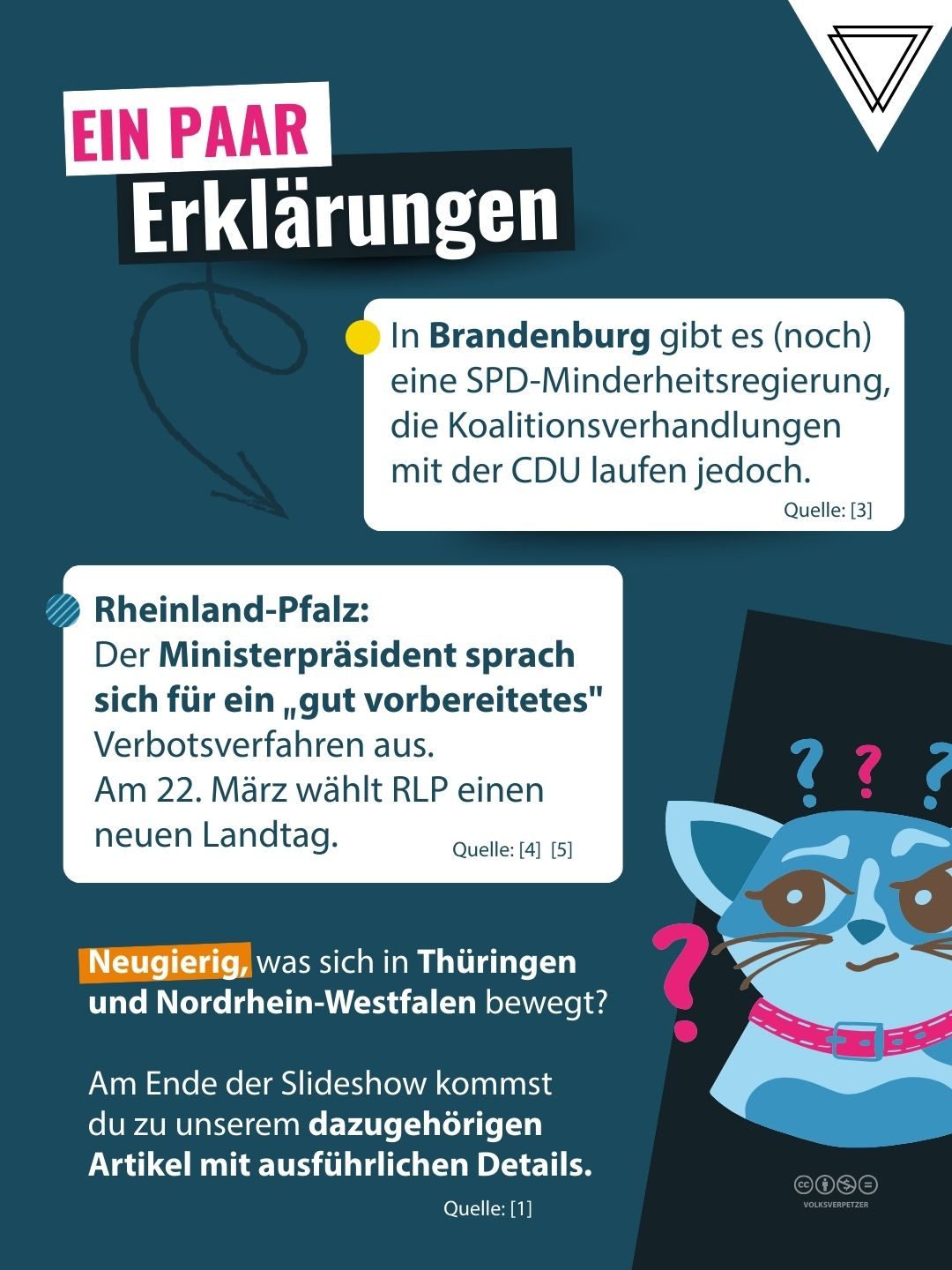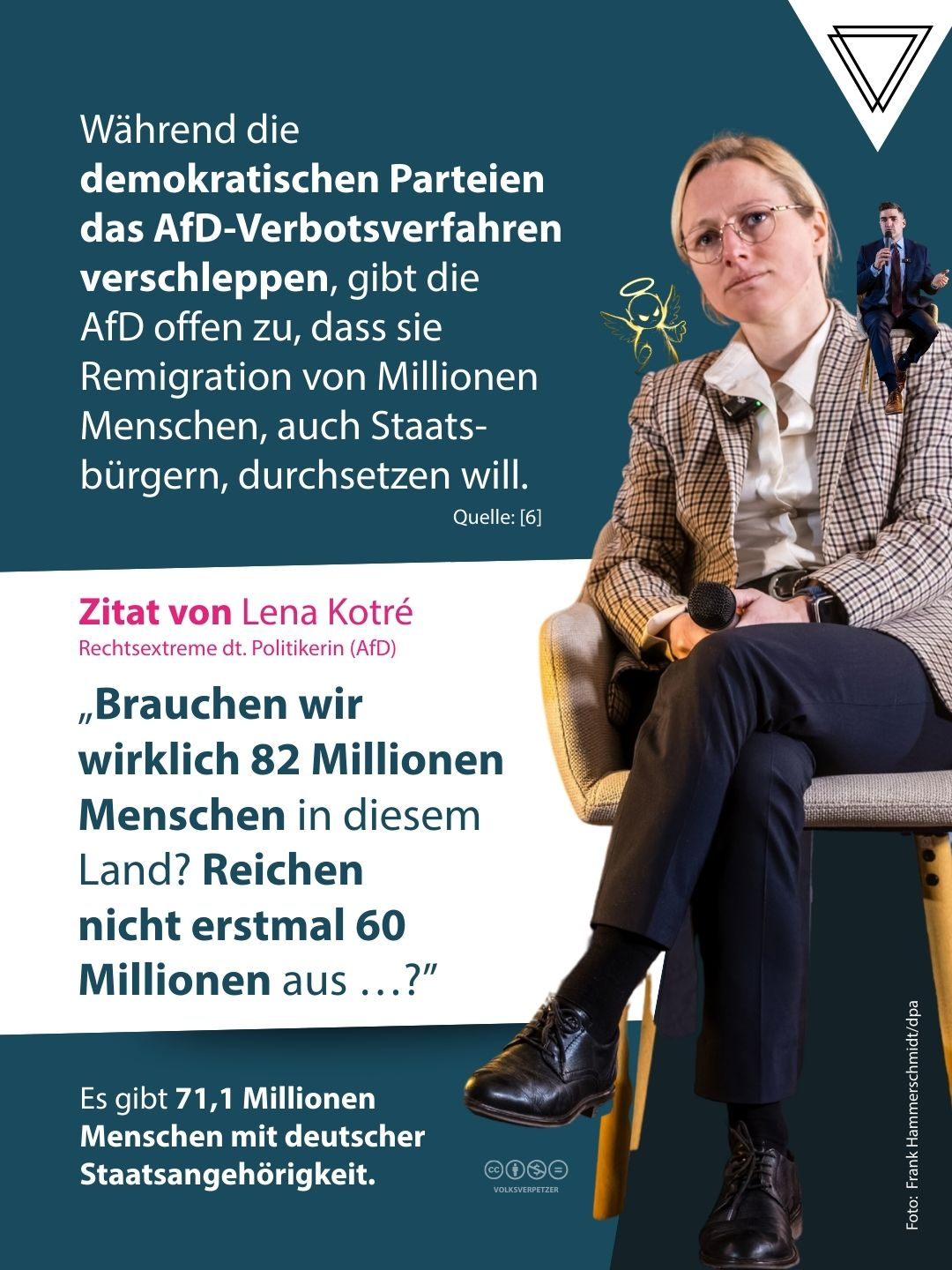Großes Zitat- und Statement-Layout auf dunkelblauem Hintergrund. Links steht: „Während die demokratischen Parteien das AfD-Verbotsverfahren verschleppen, gibt die AfD offen zu, dass sie Remigration von Millionen Menschen, auch Staatsbürgern, durchsetzen will.“ Darunter „Quelle: [6]“. Rechts sitzt Lena Kotré auf einem Stuhl mit Mikrofon (im Bild als „Zitat von Lena Kotré, Rechtsextreme dt. Politikerin (AfD)“ bezeichnet); auf ihrer Schulter sitzt Faschist Martin Sellner klein. Großes Zitat: „Brauchen wir wirklich 82 Millionen Menschen in diesem Land? Reichen nicht erstmal 60 Millionen aus …?“ Unten steht: „Es gibt 71,1 Millionen Menschen mit deutscher Staatsangehörigkeit.“ Am rechten Bildrand ein Fotocredit