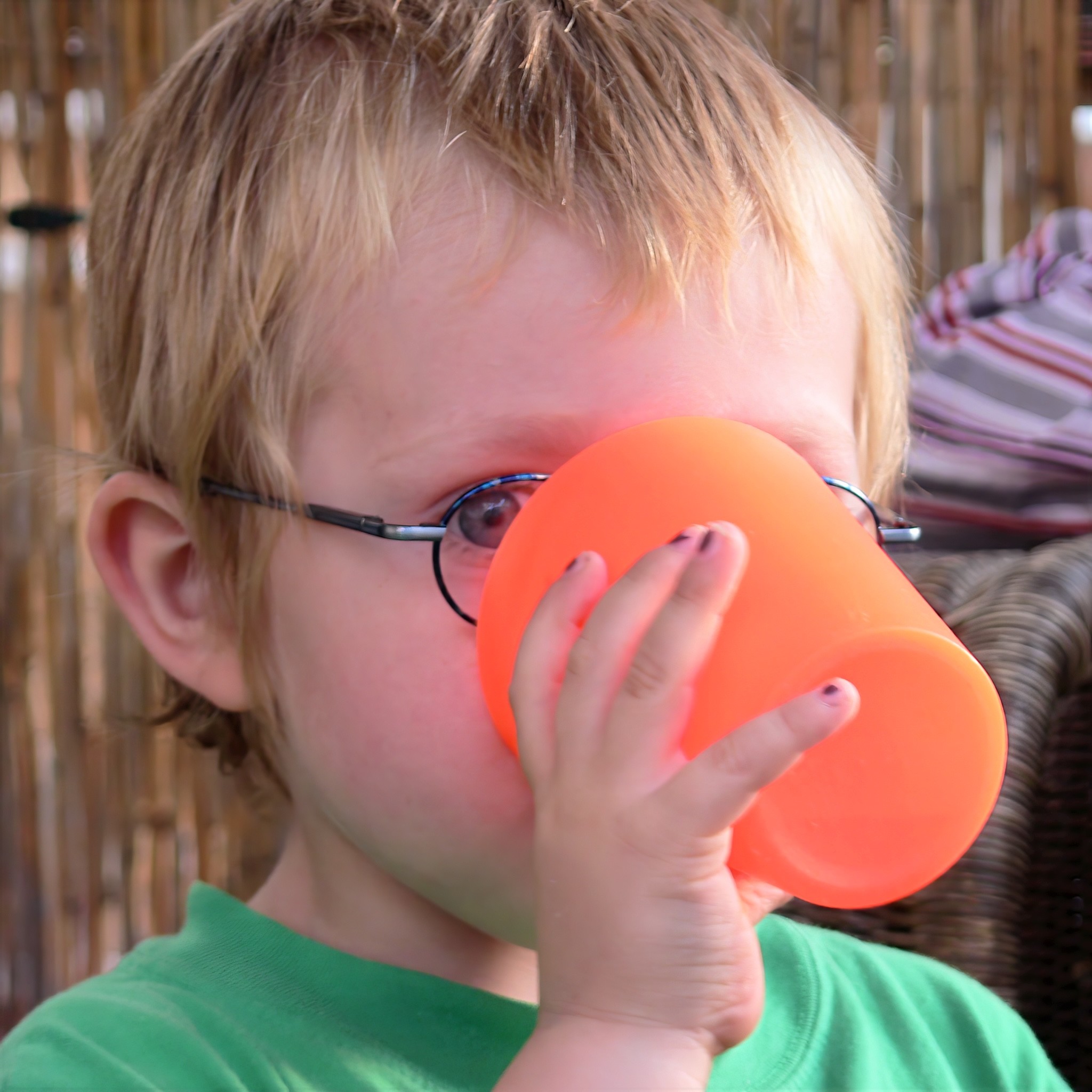 Das quadratische Farbfoto zeigt ein kleines Kind mit blonden Haaren und Brille mit blauer, abblätternder, Farbe, das einen grellorangen Becher zum Mund führt und daraus trinkt. Im Hintergrund ist ein Bambuszaun sowie ein Stuhl und ein Stück Stoff erkennbar.