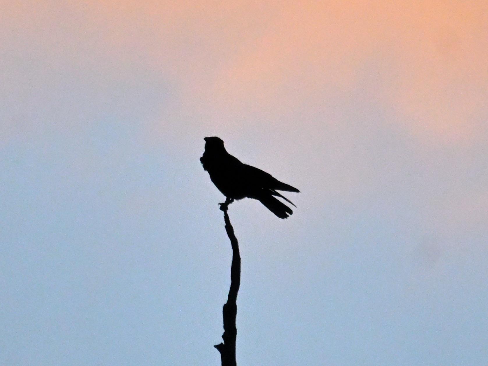 Eine Silhouette eines Krähenvogels, der auf einem dünnen Ast vor einem Pastellhimmel sitzt und von Blau zu zartem Orange übergeht.