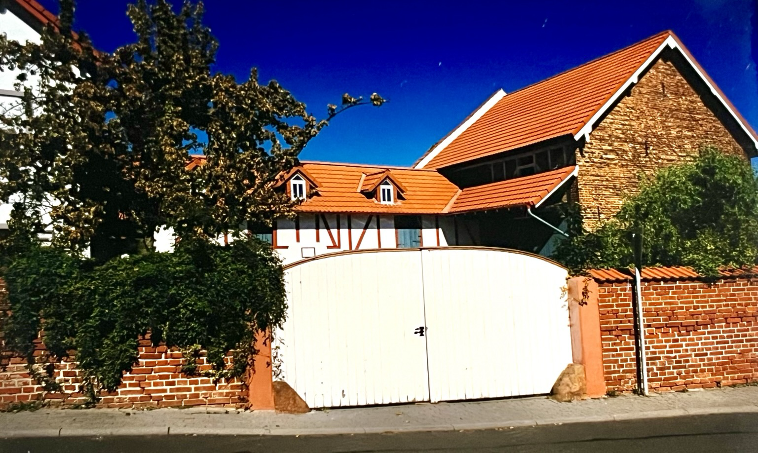 Hinter einer orange roten Ziegelmauer, in der sich ein großes, weißes Tor befindet, sieht man die Gebäude eines alten Bauernhofs mit orange Ziegeln auf den Dächern. Der Himmel darüber ist strahlend blau.