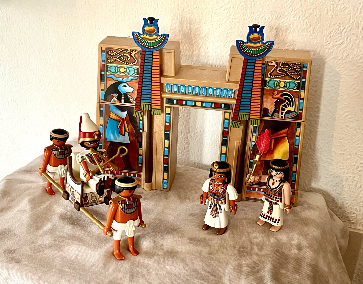 Playmobilfiguren. Im antiken Ägypten. Vor einem großen Eingangsportal zum Palast des Pharao, der unter anderem in orange und blau bemalt ist, wird der Pharao auf einer Säfte von zwei Sklaven getragen. Seine Frau erwartet ihn bereits.