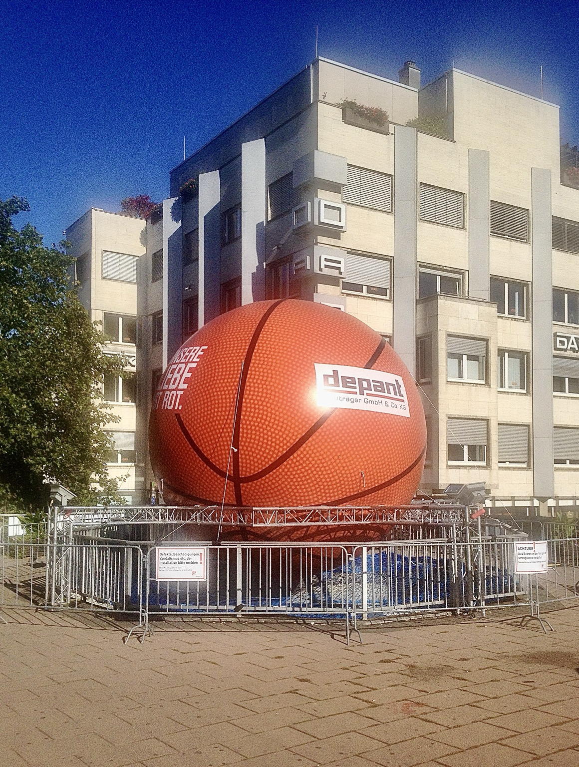 Vor einen Weiß beigen Hochhaus liegt zu Werbezwecken. Ein riesiger, orangener Basketball auf einem Gestell. Längst davon ein grüner Baum und darüber strahlend blauer Himmel.