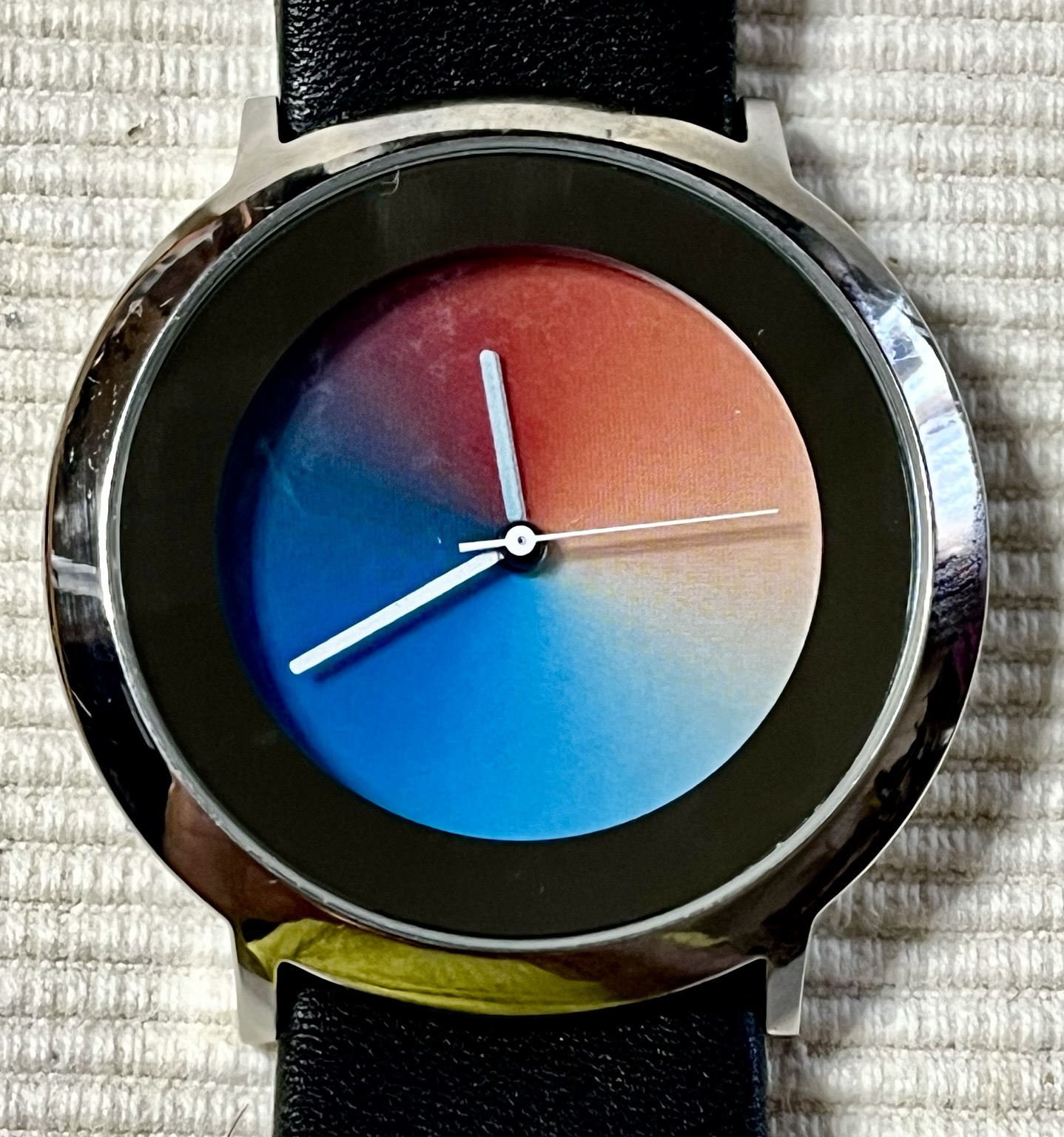 Eine silberne Armbanduhr mit einem Zifferblatt in den Farben, dunkelblau, rot orange, weiß und hellblau