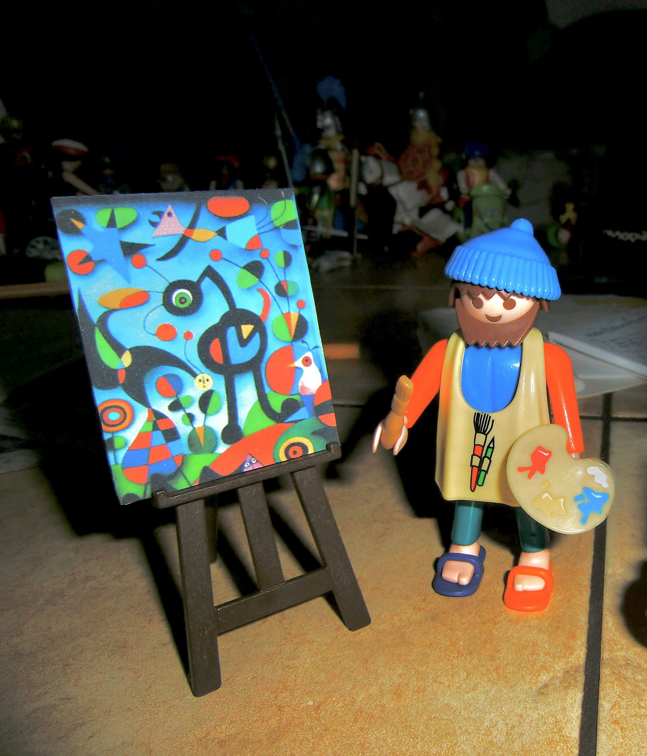 Playmobilfigur. Ein kleiner Kunstmaler mit blauer Mütze blauen rumpfor, Orangen,armen und Orangensandalen steht vor seinem Gemälde, dass