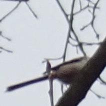 nur 200 pixel breiter quadratischer ausschnitt aus einem viel größeren gegenlicht-foto. vom unteren bildrand zum rechten ragt schwarz ein etwas dickerer ast. auf ihm sitzt, teilweise vom ast verdeckt, ein kleiner vogel. wir blicken von unten hoch und sehen somit den weißen bauch und den unteren rand des dunklen angelegten flügels sowie die langen schmalen schwarzen schwanzfedern. darüber zeichnen ein paar dünne zweige ein krakelee in den hellgrauen hintergrundhimmel